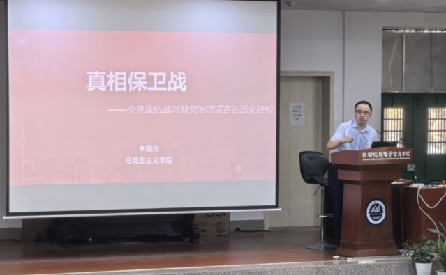 教师李国亮博士以“真相保卫战”为主题,向同学们宣讲了全民族抗战时期党治理谣言的历史经验。