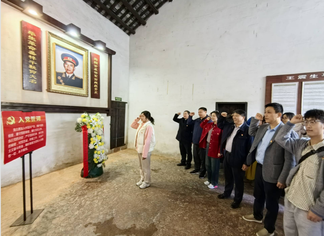上午,党员们统一乘车来到王震故居,在故居堂屋,全体党员首先列队肃立,重温入党誓词,铿锵有力的誓言回荡在青砖黛瓦之间,进一步强化了党员的身份认同与使命担当。在讲解员引导下,大家循着历史足迹走进陈列馆与事迹展厅,重温将军从抗日烽火到解放战场的戎马征程,深切感悟他带领军民开展南泥湾大生产、屯垦戍边的开拓锐气与担当精神。展柜中泛黄的旧衣物、字迹斑驳的书信手稿、墙上定格岁月的黑白照片,无不生动诠释着将军探索真理的勇气、忠贞不渝的信仰和高瞻远瞩的眼光,让在场党员深受触动、倍感振奋。