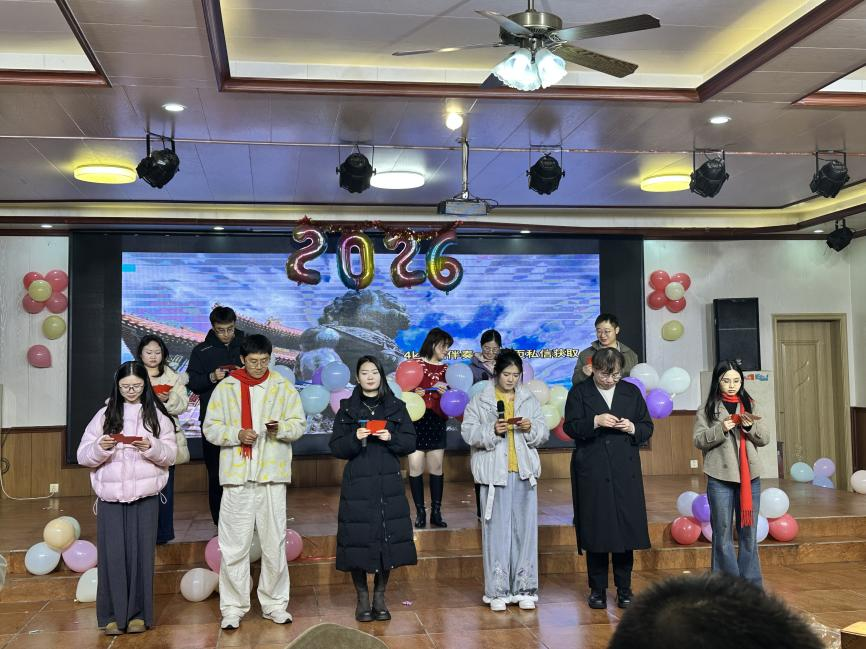 之后联欢晚会精彩上演。节目内容丰富多彩,包括舞蹈《越女词》、书法表演《纸墨》、歌曲《新贵妃醉酒》《Baby》《倔强》《暗里着迷》《最炫民族风》《如愿》以及朗诵《新年颂歌》。现场还穿插了幸运抽奖、数字礼盒游戏、“你比我猜”、“听歌识曲”和“互踩气球”等互动环节,将现场气氛推向高潮。